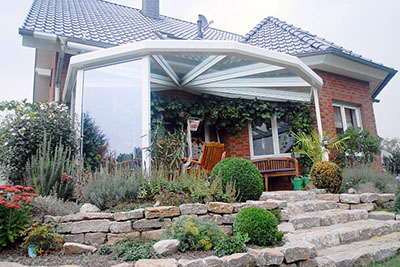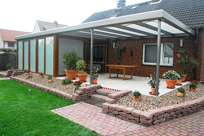 Um die Terrasse noch wohnlicher zu gestalten, können wir die Überdachung mit zusätzlichen Windschutzelementen versehen. So können Sie auch an windigen Tagen in Ruhe unter Ihrer Überdachung sitzen.